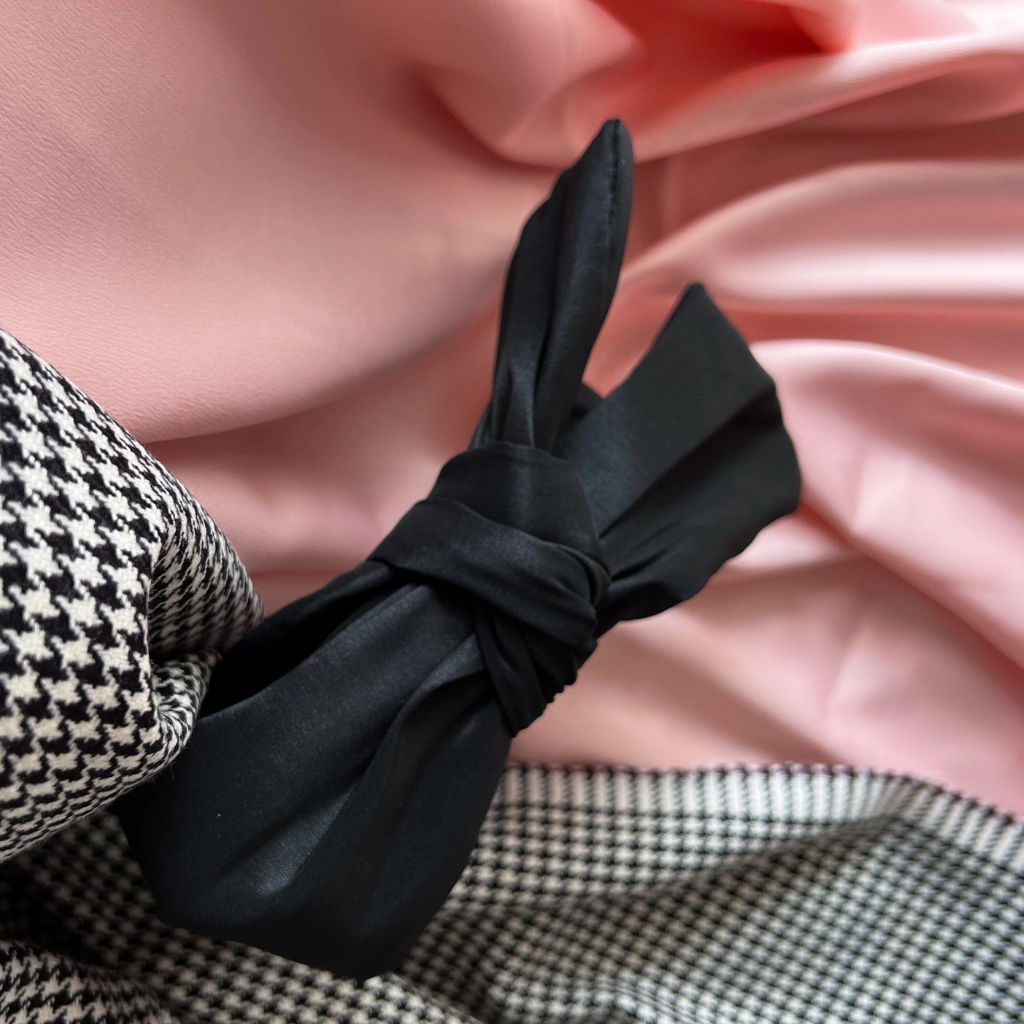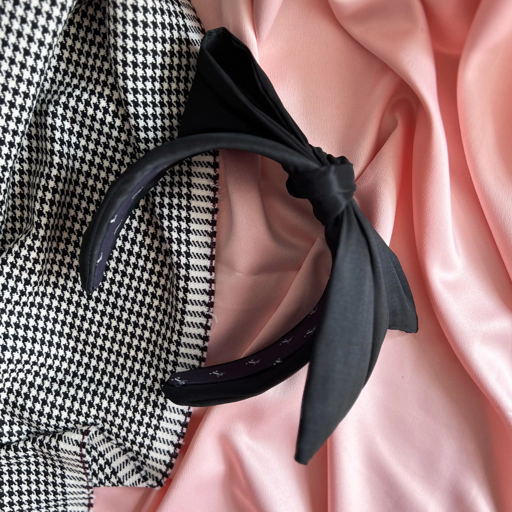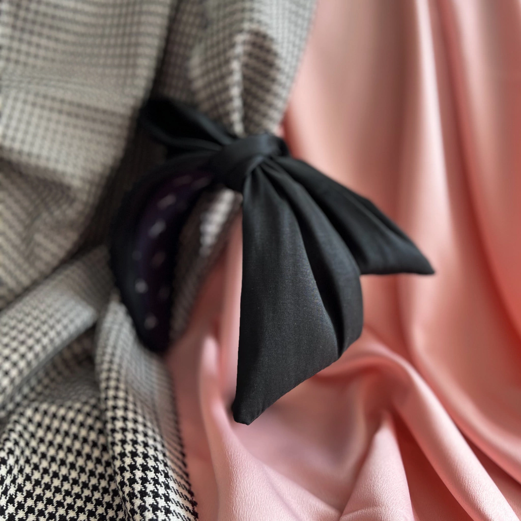 Diadema con lazo al costado realizada con genero de seda salvaje natural en color negro.
